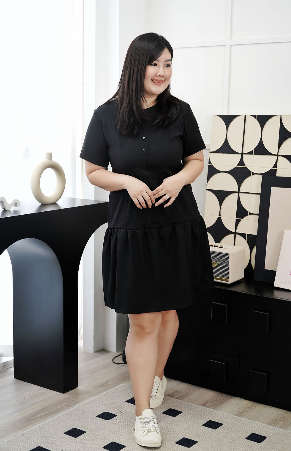 - Model J is 162cm, wears UK12